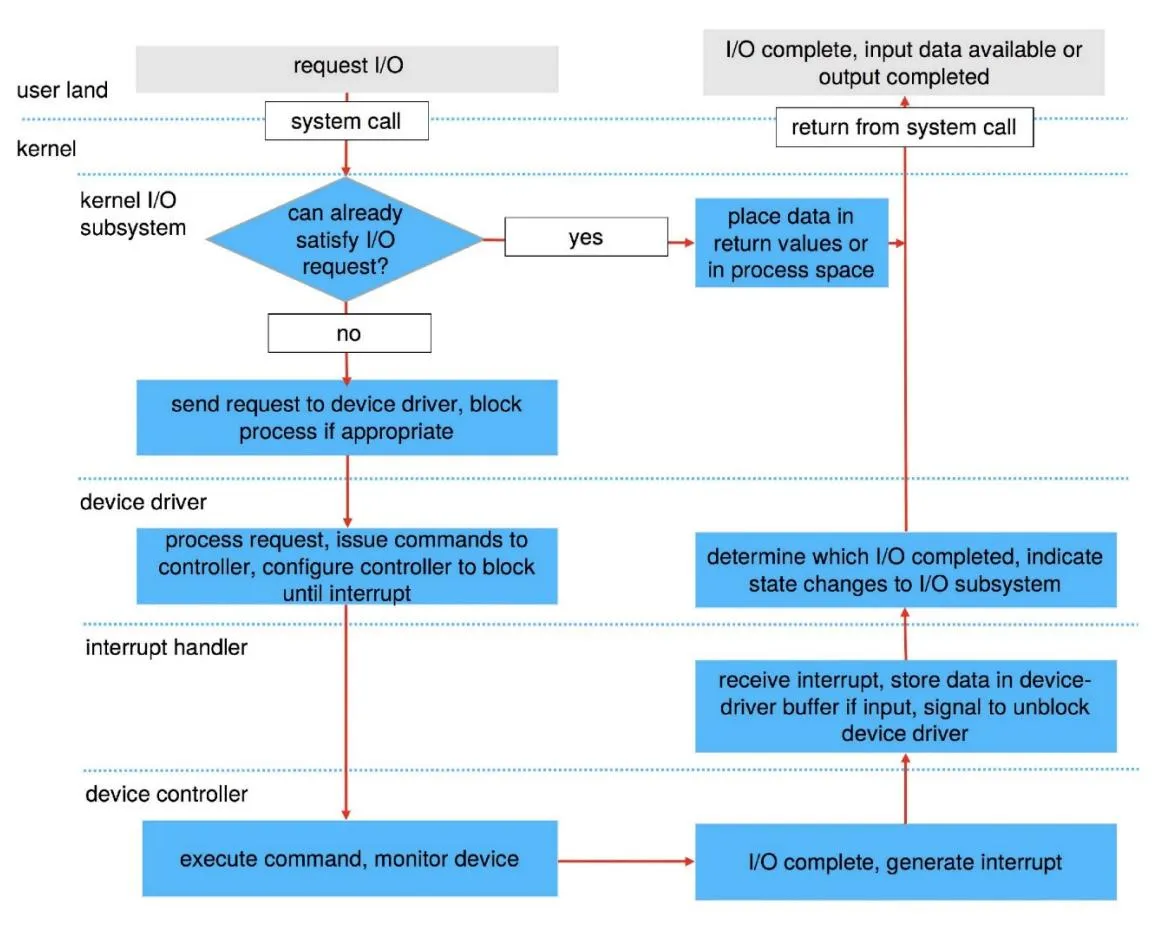 Section titled “Problem 1: I/O request life cycle”Describe in detail the life cycle of an I/O request such as “read”. That is, explain the entire set of steps taken from the time the user app issues the “read” system call until the system call returns with the data from the kernel. Assume that the I/O request completes successfully.