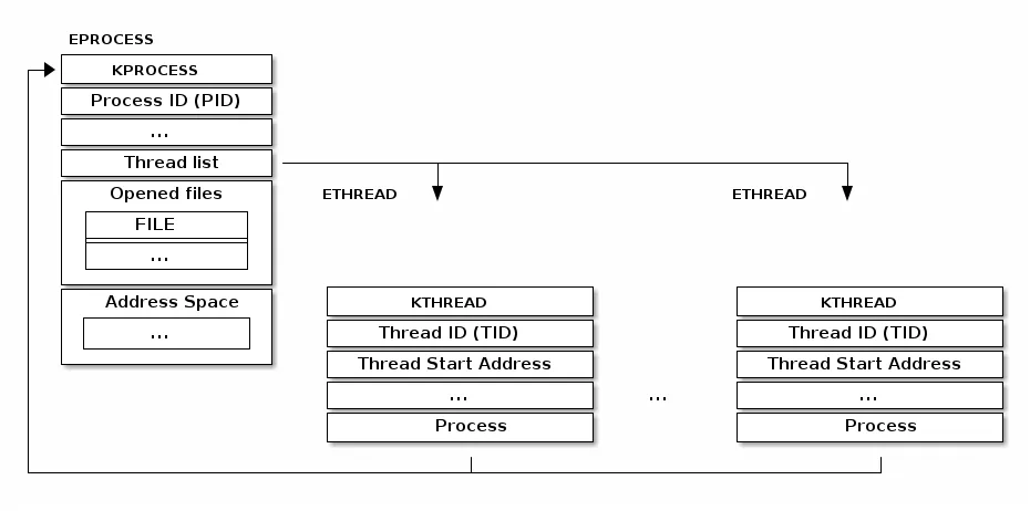 Section titled “Representing Threads in the Kernel: Windows”Threads are implemented as a separate DS (Thread Control Block - TCB), which is then linked to the Process Control Block (PCB)