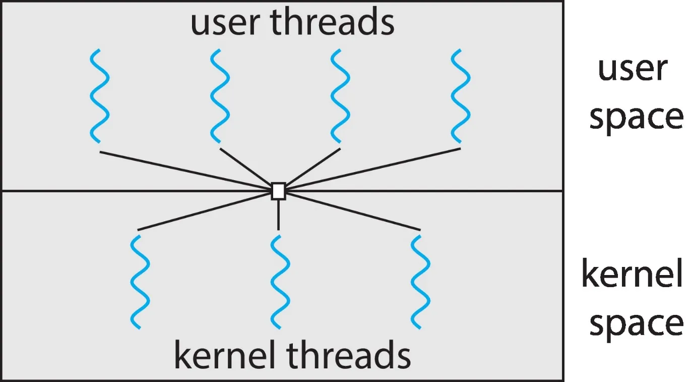 Section titled “Threading Models: Many-to-One”Many user-level threads mapped to single kernel thread A user-level library manages thread creation/management But: When a user-level thread blocks for I/O, all the other user-level threads get blocked with it Also: The kernel can NOT schedule multiple user-level threads in parallel Rarely used (Solaris Green Threads, GNU Portable Threads)