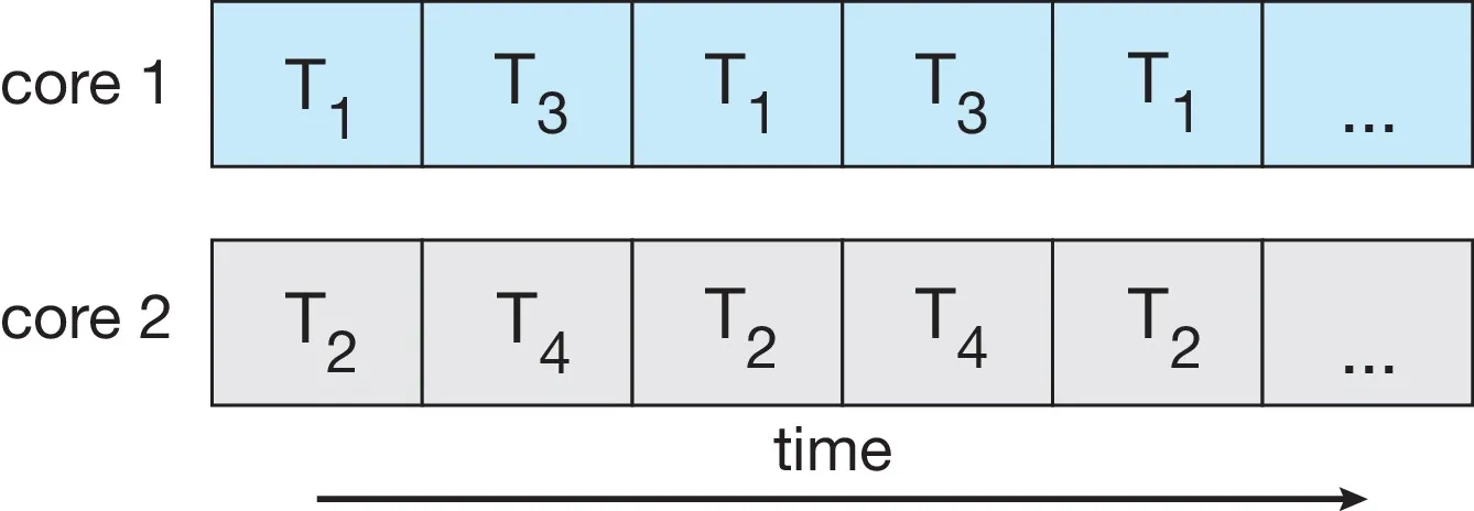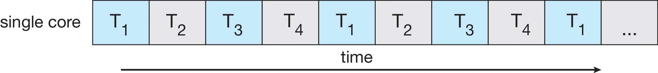 Section titled “Concurrency vs Parallelism (2)”Concurrent execution of 4 threads T1, T2, T3 and T4 on a single-core system