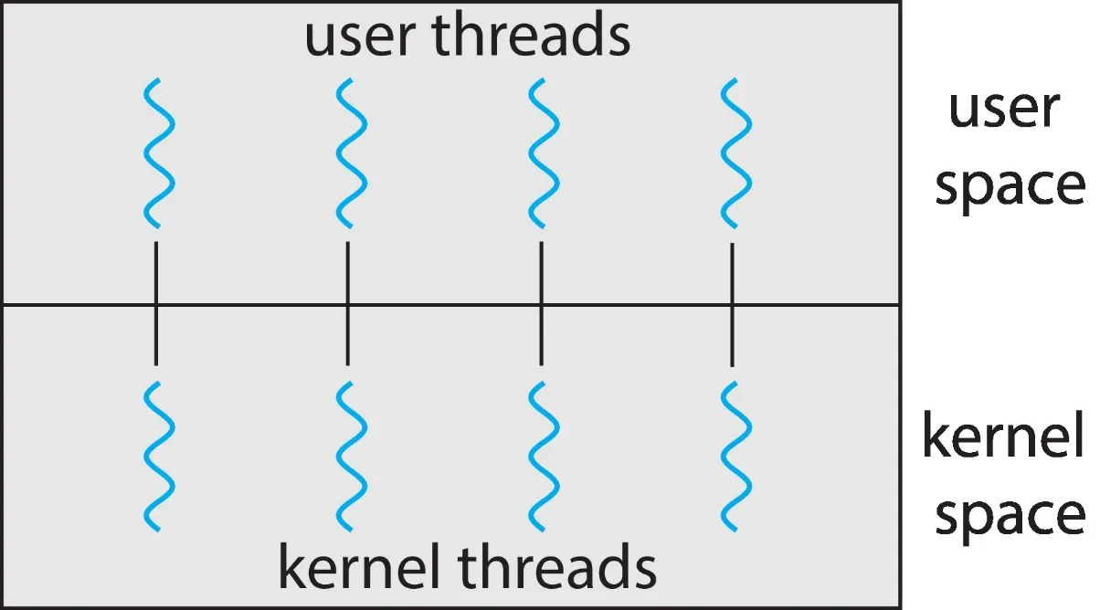 Section titled “Threading Models (Windows, Linux): One-to-One”Each user-level thread maps to a kernel thread Creating a user-level thread creates a kernel thread Thread creation and management requires system calls (clone to create) Adv: When a thread blocks for I/O, the kernel can schedule another thread leading to true concurrency Also: The kernel CAN schedule multiple threads in parallel