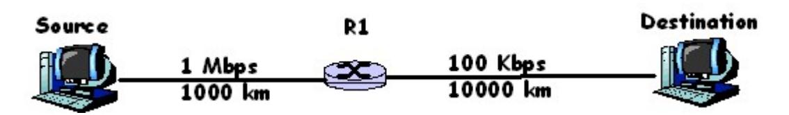 Section titled “Problem 7: Multi-Hop Network Delays”Consider the packet switched network shown below. The bandwidth of the link between the source and router R1 is
